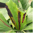 Phoenix species are susceptible to False Smut (Graphiola phoenicis). This fungus forms yellow leaf spots that become hard with a raised with a blackish scab, which produces masses of powdery spores that are thread-like.