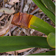 The leaf tips are reddish brown soon after emerging, with small raised or lacerated spots that form longitudinal lines. These spots may also appear on the bulb scales and the flower, turning yellow-brown with a scorched appearance.