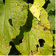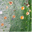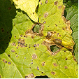 The upper leaf surface becomes flecked with yellow to light green and the underside produces bright yellow orange spores that correspond to the patches above. Infested leaves become brown in patches, fall prematurely and shoots may die back as a result of not being hardened off to the elements. This overall, results in a loss of vigour and in small plants may lead to death.
