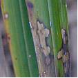 Damage is normally confined to the underside of leaves appearing as rusty patches that coalesce along the leaf veins eventually turning the whole leaf brown-grey before it collapses. Fruit is damaged, close to the bunch stalk causing the area to become dull red purple-black, which in turn becomes dry then cracks.